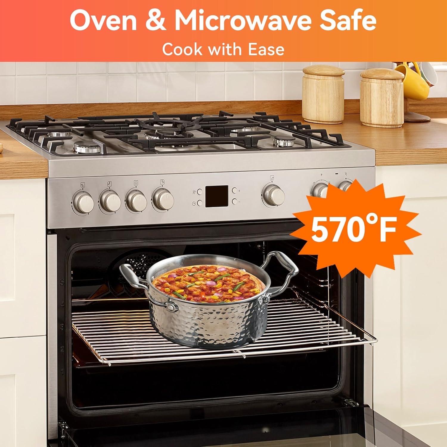 • Tempered Glass Lid & Riveted Handles – Vented lid helps prevent boil-overs; sturdy riveted stainless handles feel secure. Durable hammered exterior adds grip and style.