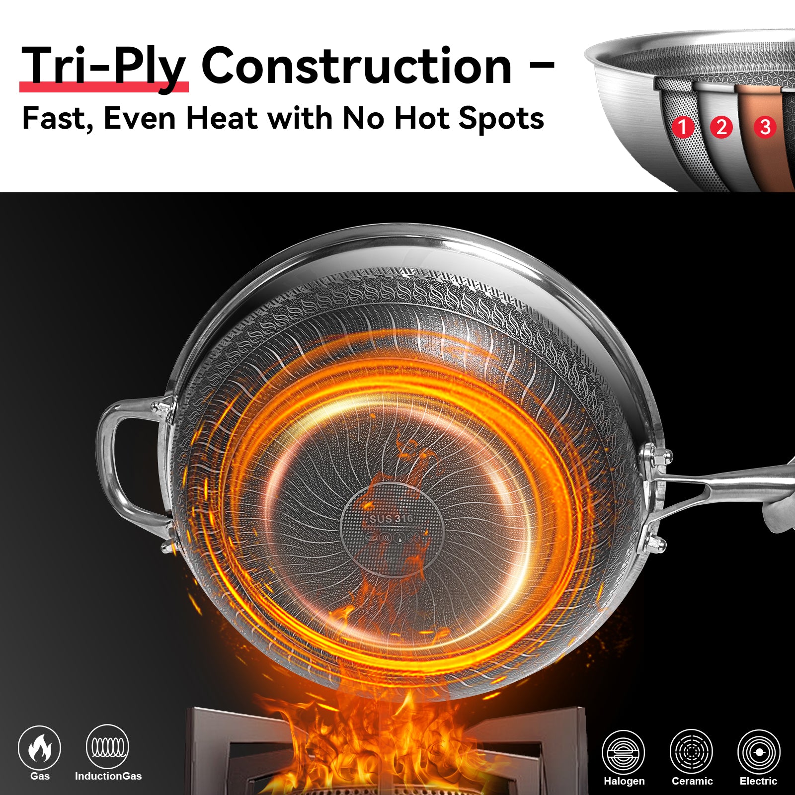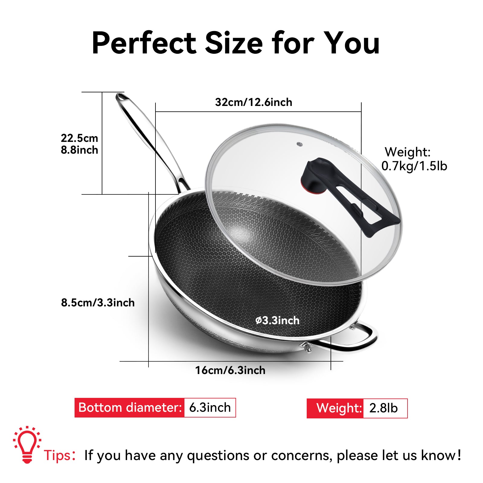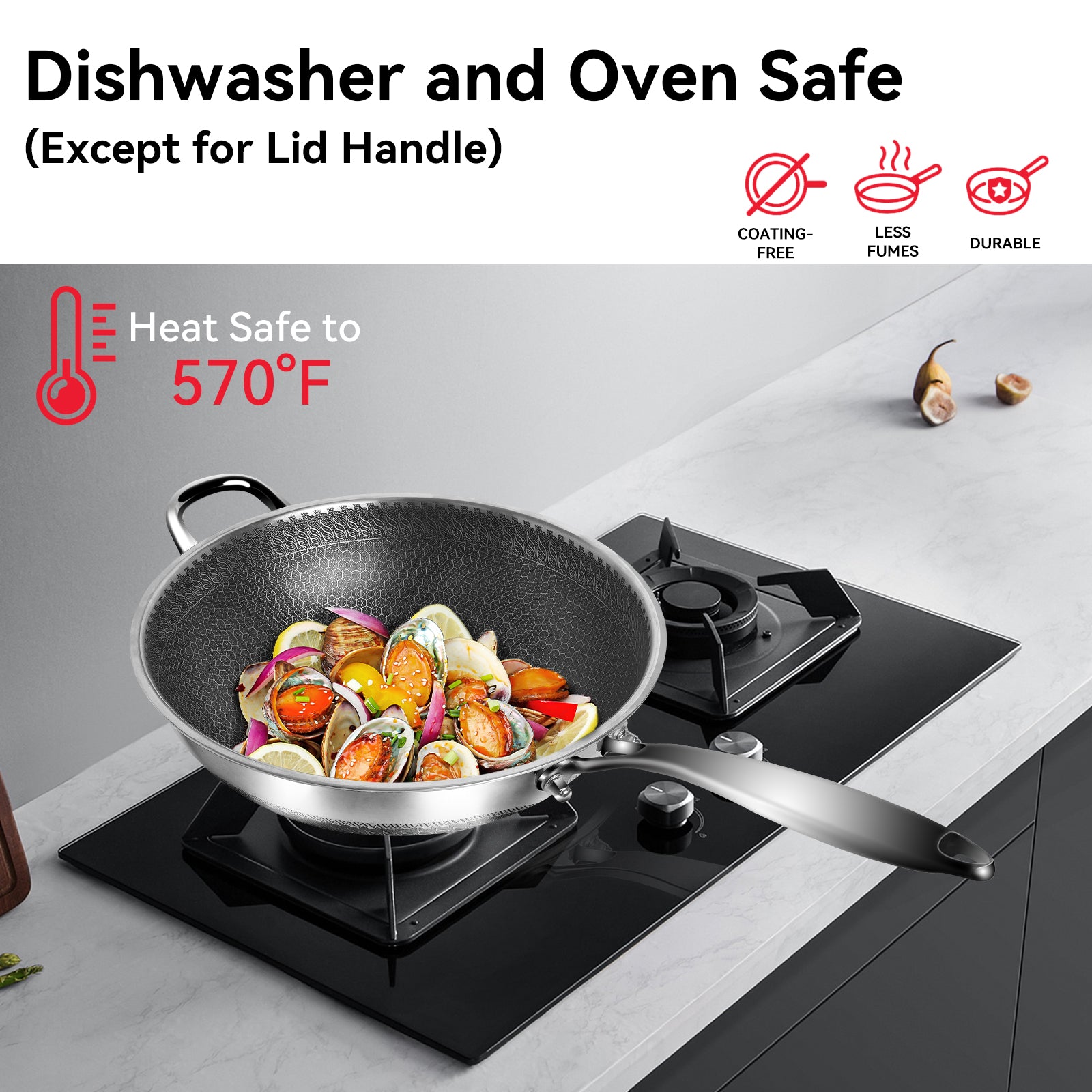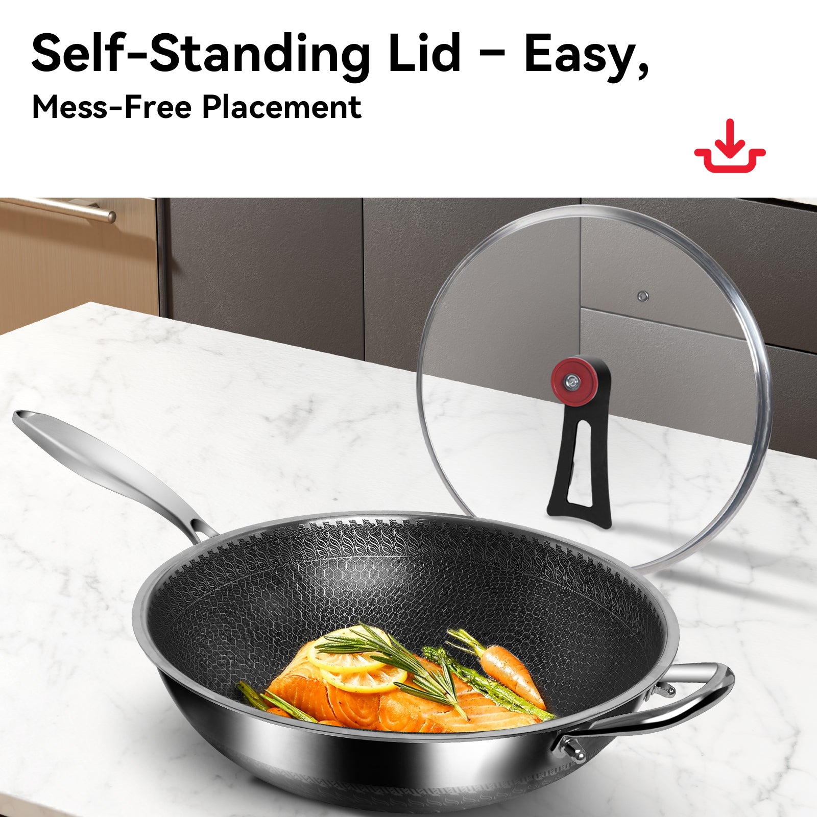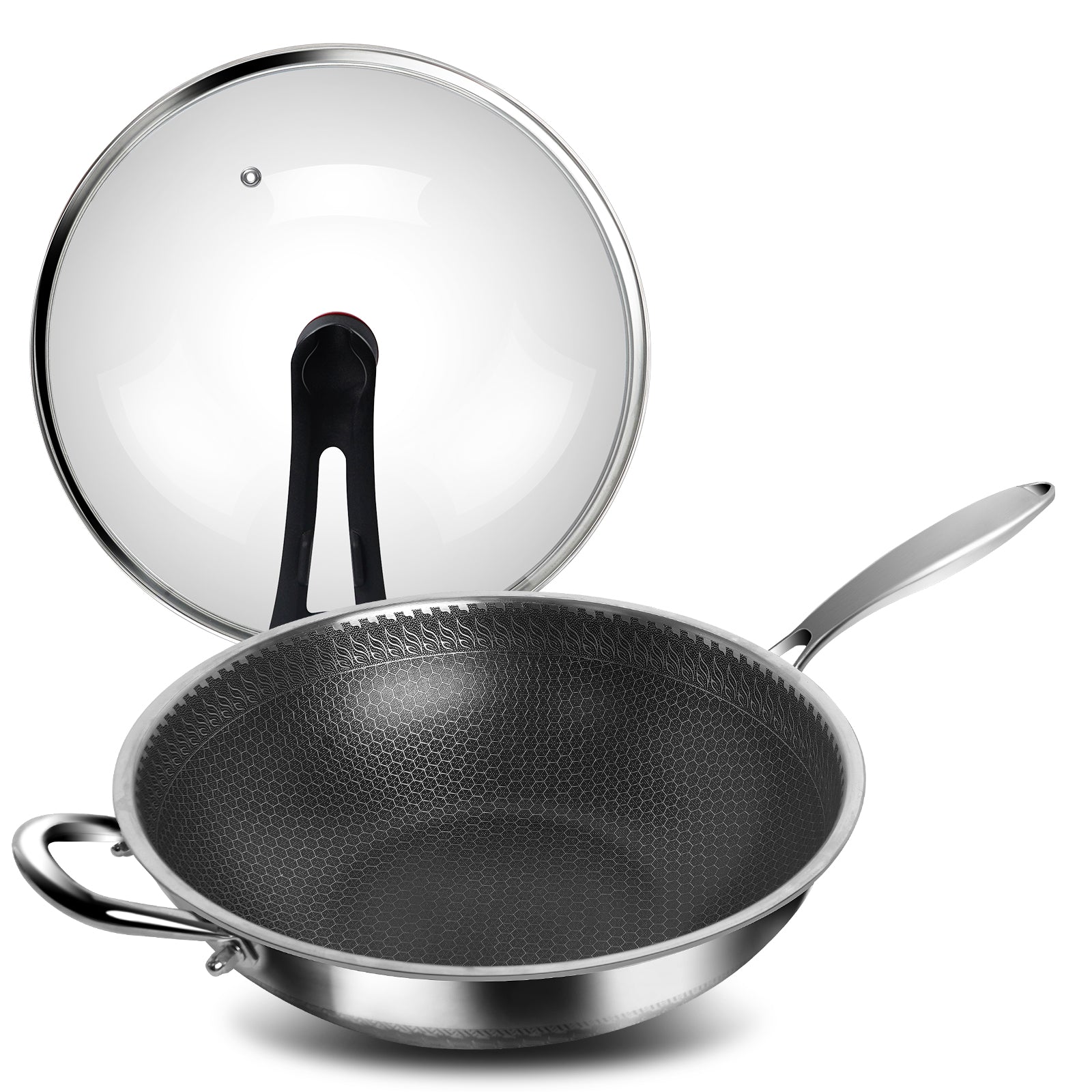 This 12.6-inch stainless steel wok features a honeycomb-textured nonstick surface and comes with a glass lid, combining durability with easy food release for efficient cooking and cleaning.