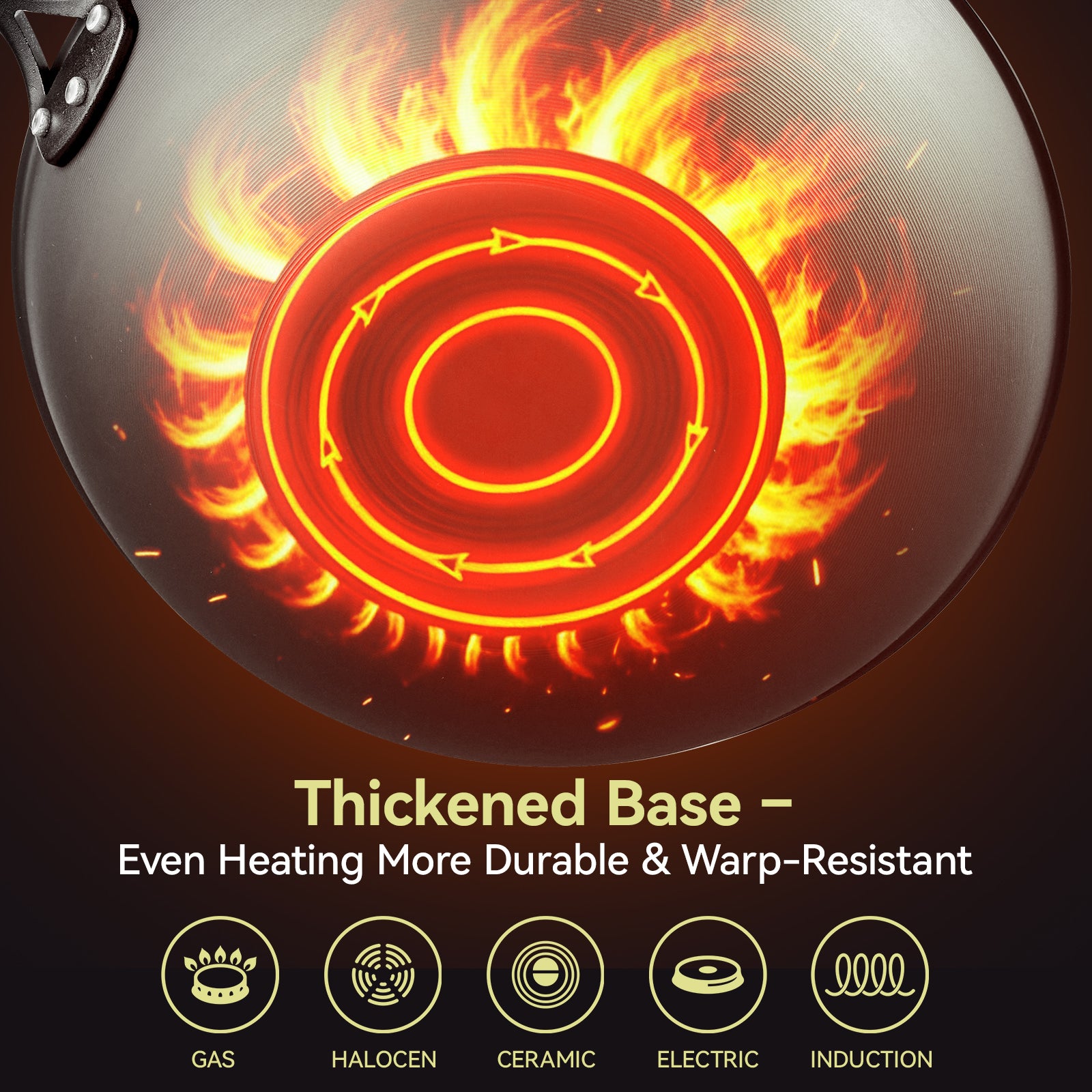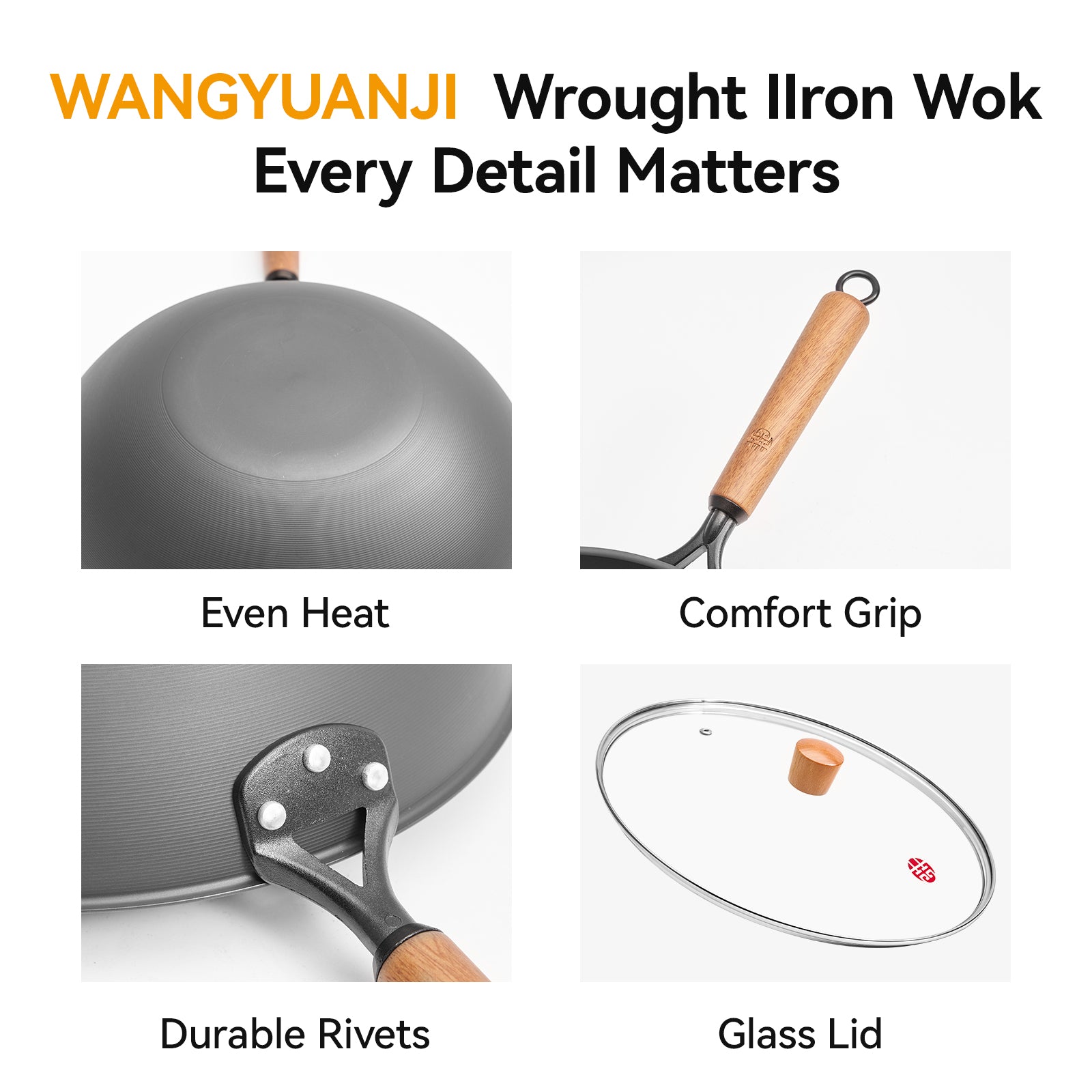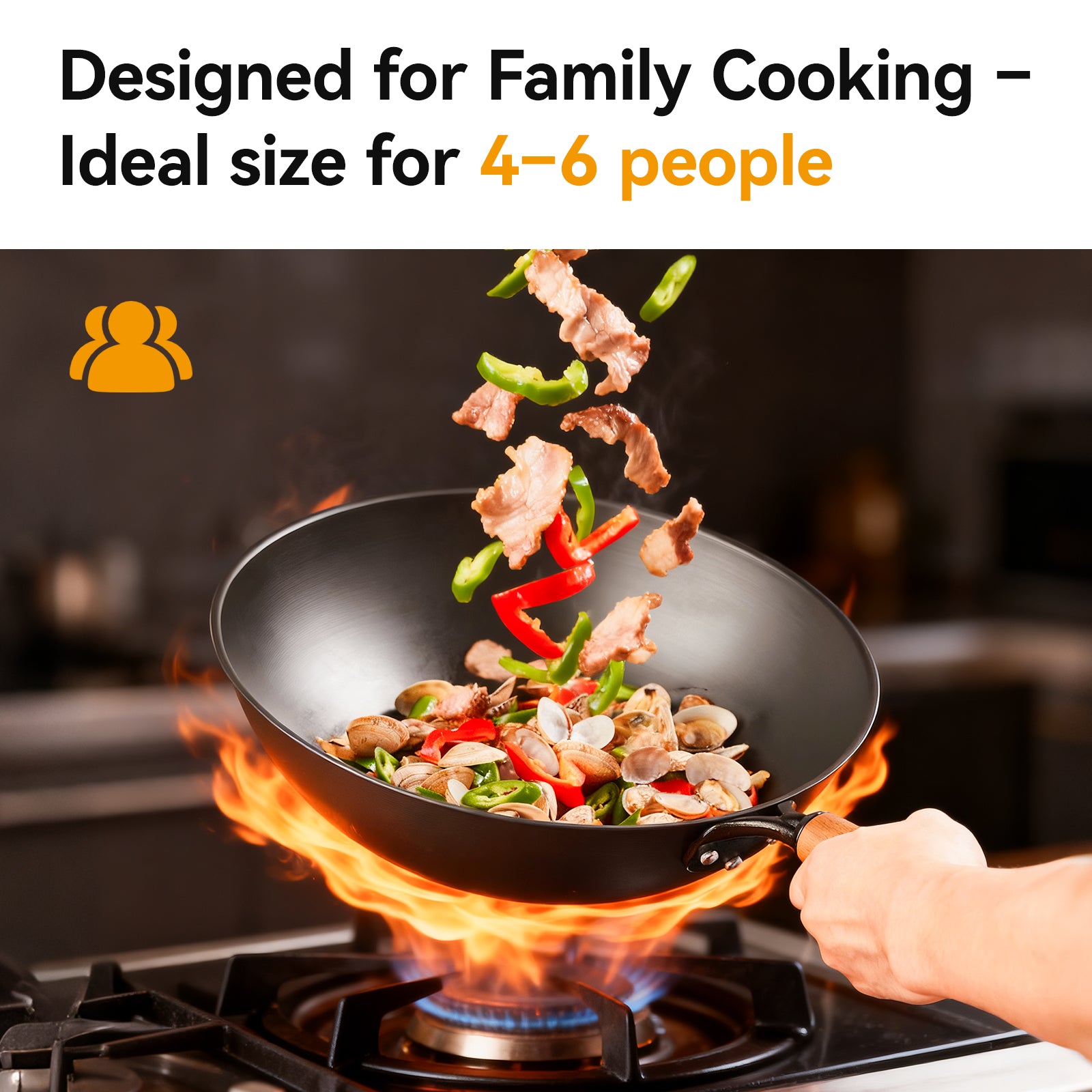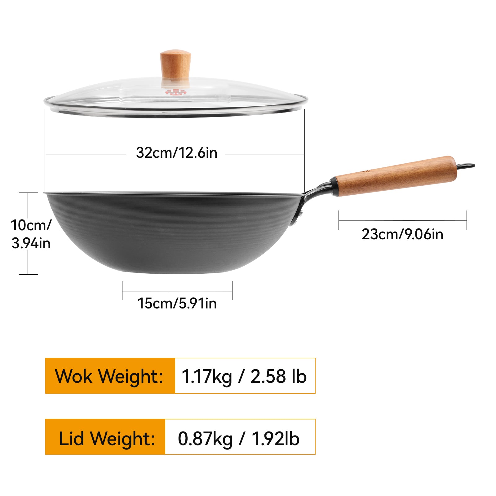 Cook like a professional with this 12.6-inch iron wok. The flat bottom design ensures stability on gas, electric, ceramic, and induction cooktops. Made from high-quality refined iron, it heats quickly and distributes heat evenly for stir-frying, sautéing, searing, and more. The tempered glass lid allows easy monitoring while locking in heat and flavor. The wooden handle offers a secure, comfortable grip and a hanging loop for convenient storage. With proper seasoning, the non-coated surface develops a natural nonstick patina for healthier, authentic home-cooked meals.