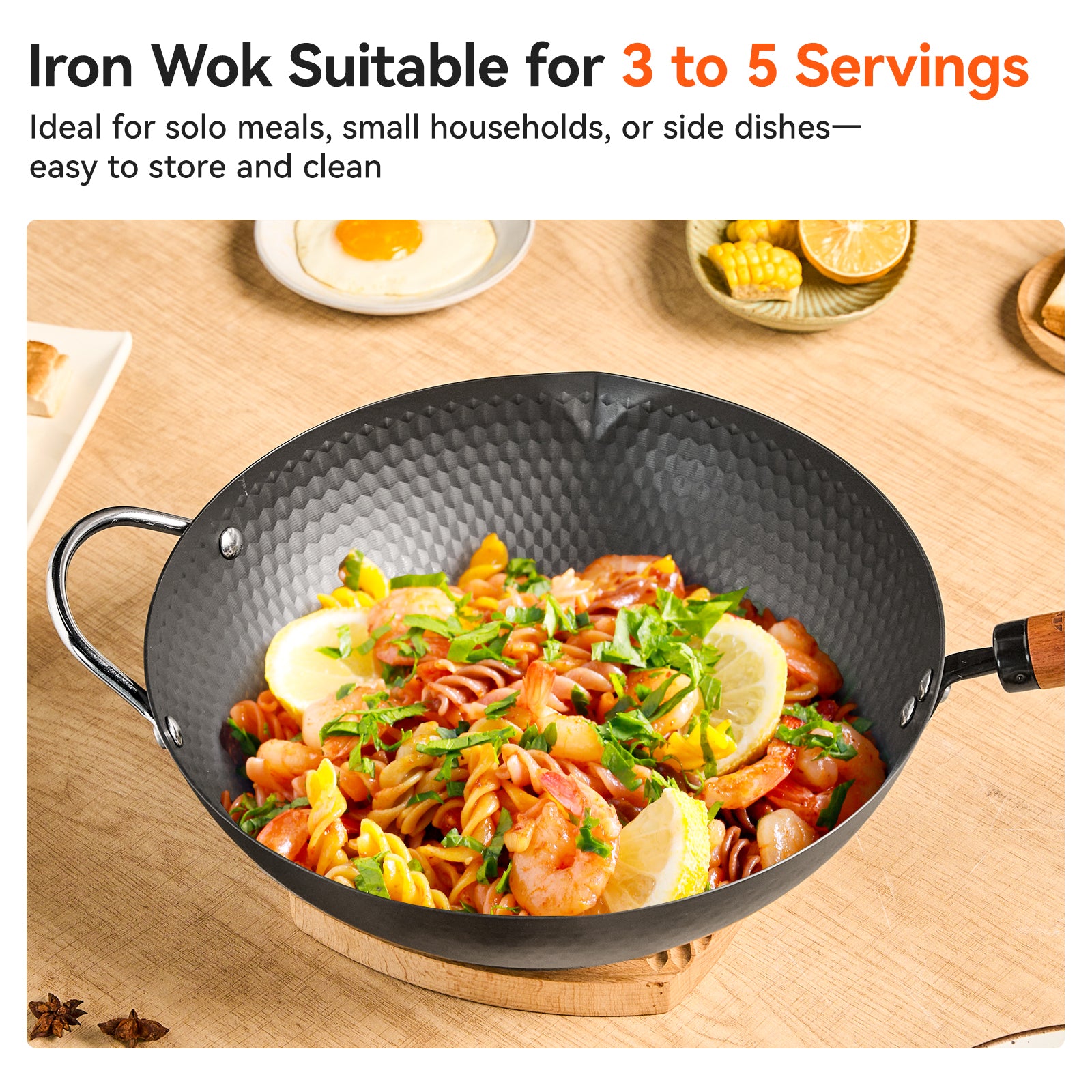This 12.6" Iron wok offers natural nonstick performance without any chemical coatings. The flat bottom ensures compatibility with induction and all stovetops. Includes a glass lid and iron spatula, making it perfect for daily stir-fry, sauté, and steaming tasks. Durable, easy to clean, and built for healthy cooking.