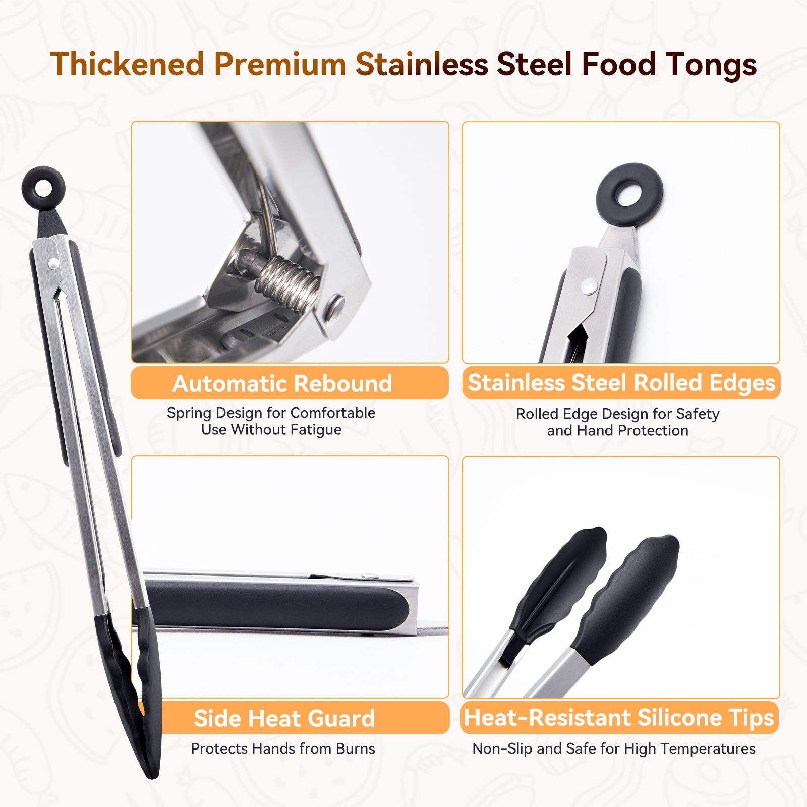 Crafted from durable stainless steel with heat-resistant BPA-free silicone tips, these tongs ensure a firm grip without scratching your cookware.