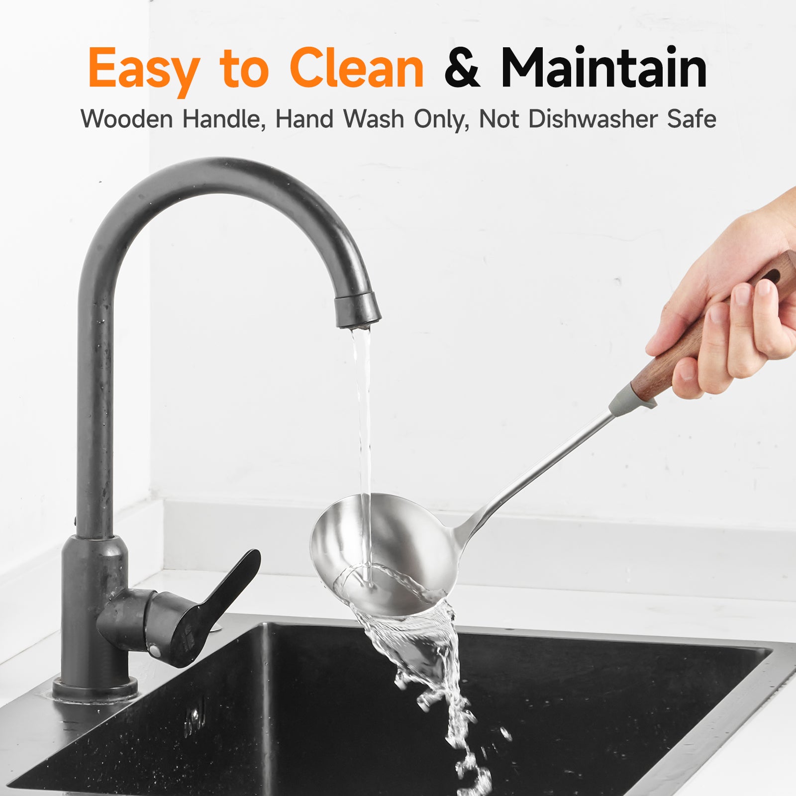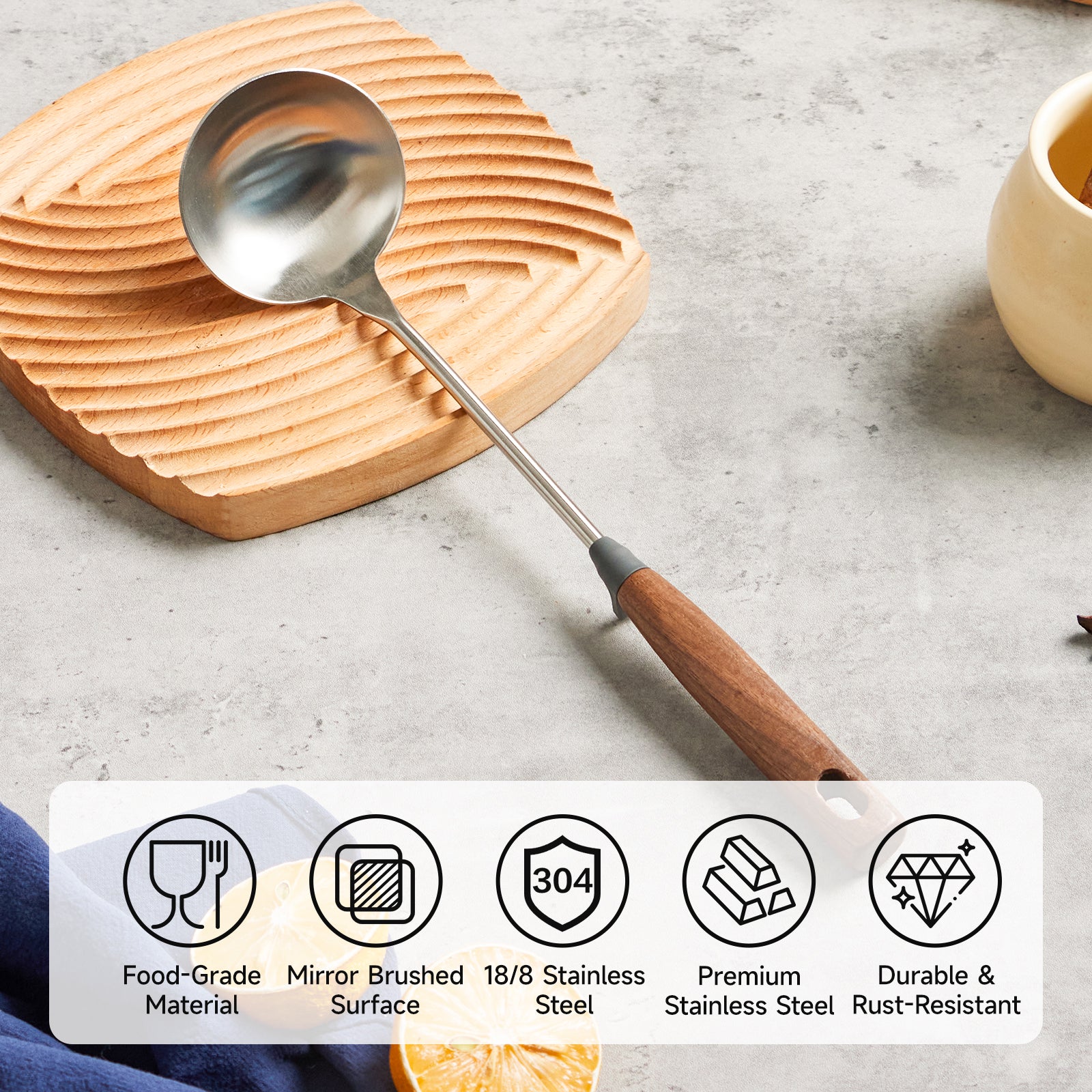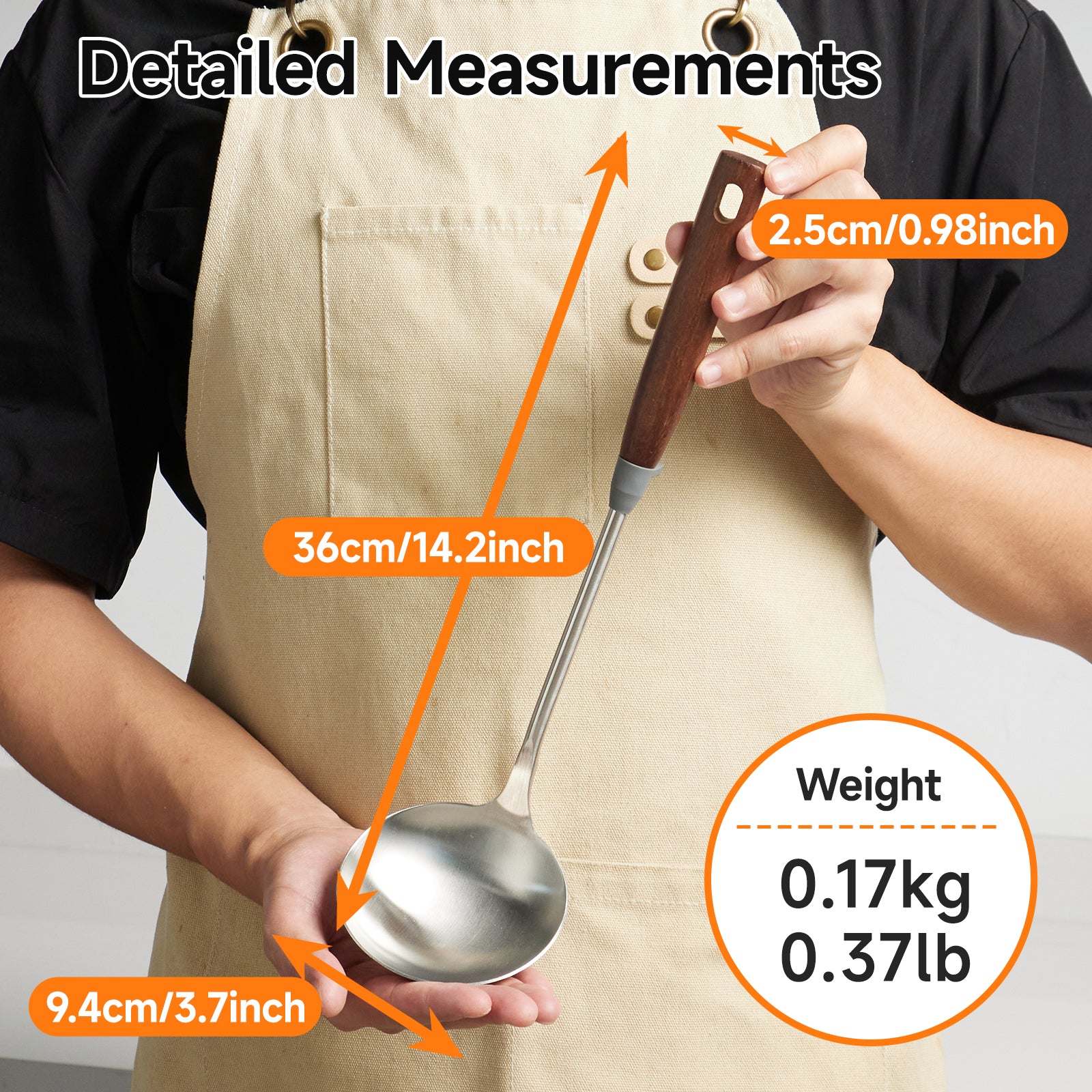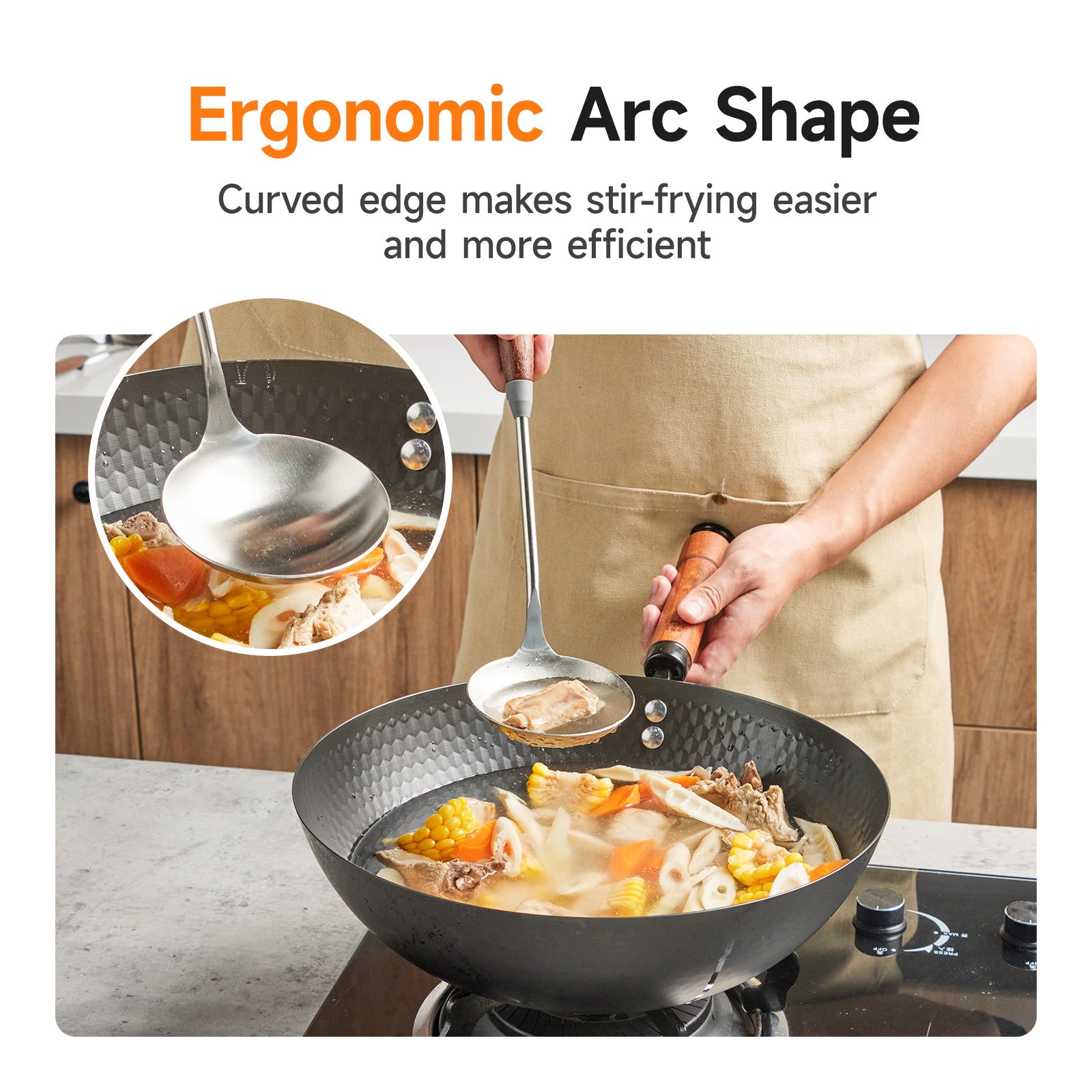 Bring authentic Asian cooking into your kitchen with the WANGYUANJI 14.2-inch Stainless Steel Wok Ladle. This premium ladle combines durable stainless steel for long-lasting strength with a natural wooden handle that stays cool and comfortable in your hand. The handle is designed with a built-in stopper that rests on the wok rim, preventing the ladle from sliding into the pan and keeping your cooking experience smooth and convenient. Its 14.2-inch length protects your hands from heat, while the coatless, chemical-free design ensures healthy, safe cooking. Easy to clean — just hand wash and dry thoroughly for years of dependable use.