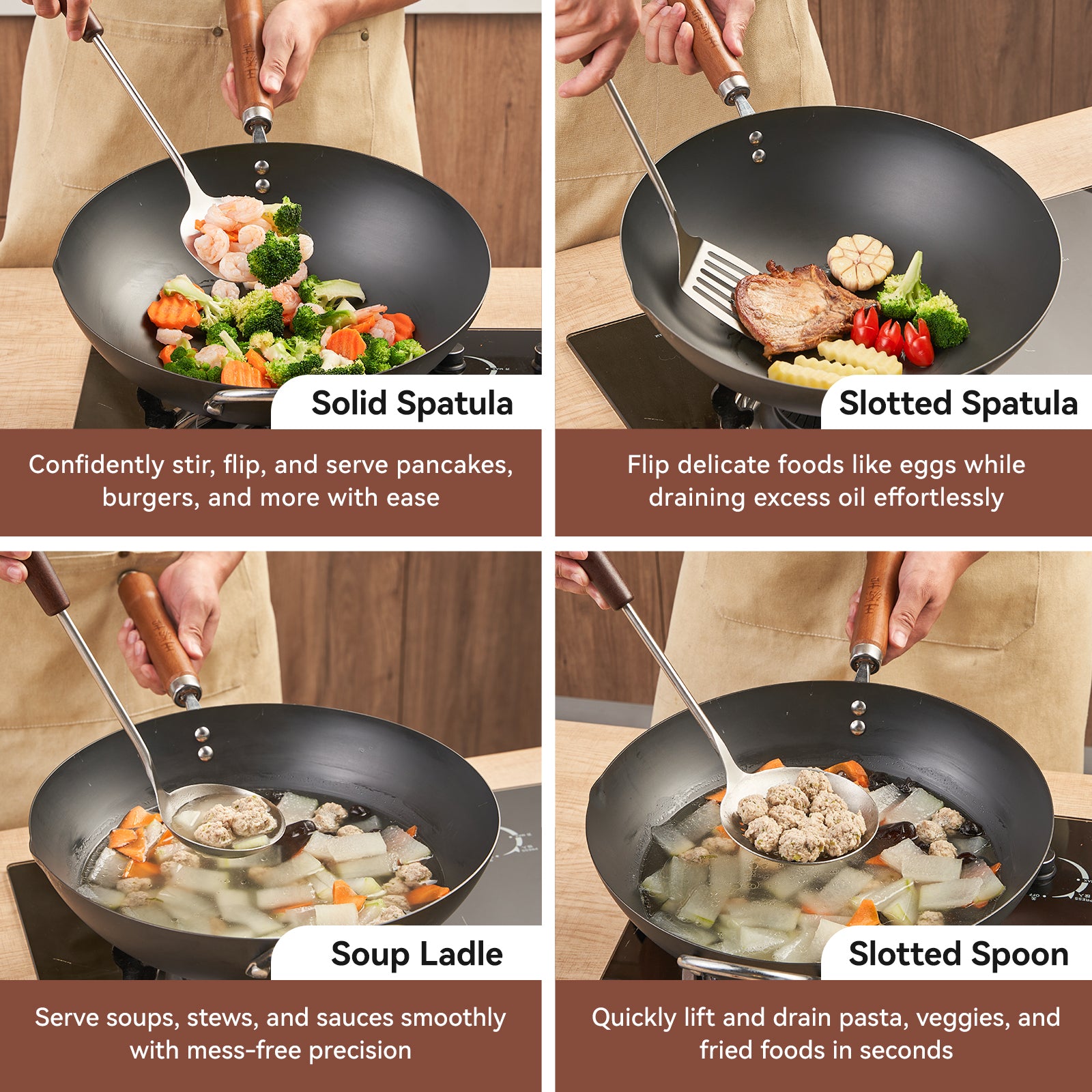 The WANGYUANJI 4-piece kitchen utensil set combines durable stainless steel with natural wooden handles for a balanced blend of strength, comfort, and classic style. The set includes a stir fry spatula, slotted turner, skimmer, and soup ladle—ideal for everyday cooking tasks. Safe for nonstick cookware and easy to clean with hanging holes for convenient storage, this set is a functional upgrade for any kitchen.